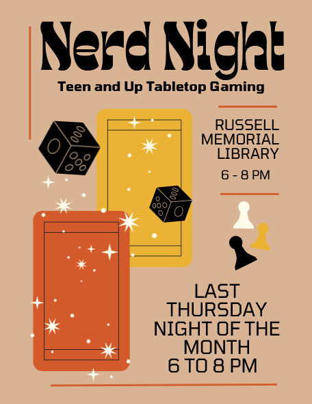 Calling all tabletop game loving nerds! Adults and tweens, come hang out at the library with Assistant Librarian Kat and community members for a fun evening of games.